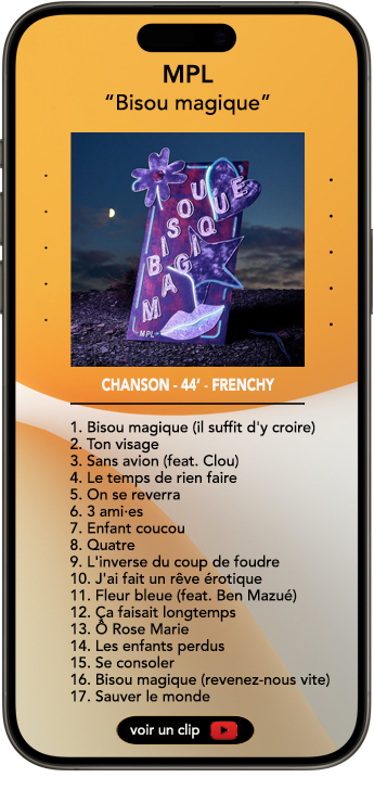Et franchement, si vous n’arrivez pas à craquer sur l’un d’entre-eux, soit vous êtes excessivement difficiles, soit il faut songer à consulter pour un problème ORL… car il y en a pour tous les goûts ou presque… Jugez plutôt, cette semaine, vous pouvez piocher dans la liste, selon ce que vous aimez, de la pop ou du rap, du rock ou de la chanson, du blues ou de la folk, de l’électro ou du métal, de la soul ou du R&B, un peu de punk ou un peu de latino…